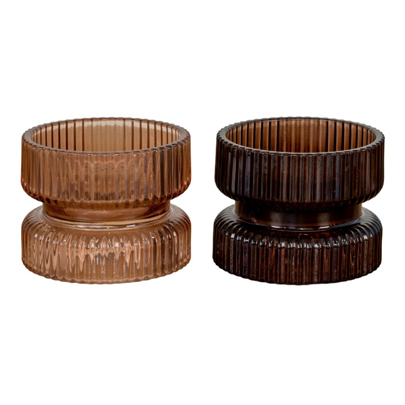 Candle holder reversible for tealight and block candle in amber + brown glass Ø9x7 cm, set of 2